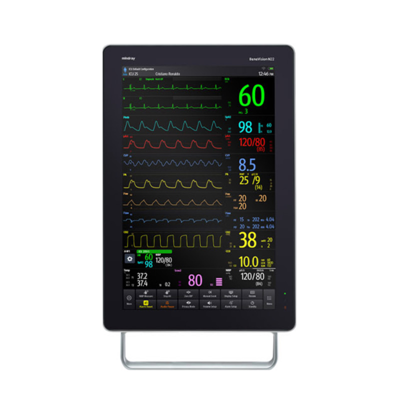 BeneVision N22/N19 Patient Monitor** is a high-acuity multi-parameter monitoring system designed for ICU, operating rooms, and emergency departments. It features large 19-inch or 22-inch HD capacitive touchscreen displays with an user interface and flexible portrait or landscape viewing. The monitor supports comprehensive parameters including ECG, SpO₂, NIBP, IBP, respiration, temperature, and arrhythmia analysis. With advanced clinical decision support, extensive data storage, wireless connectivity, and integration with external medical devices, it provides reliable real-time monitoring and enhances clinical workflow efficiency.