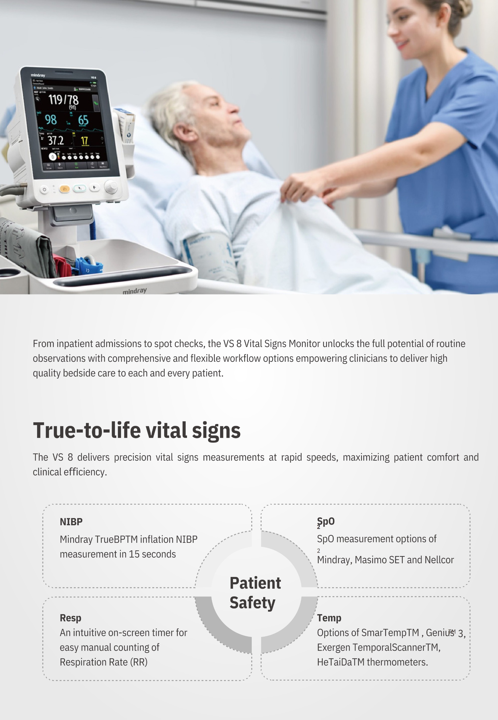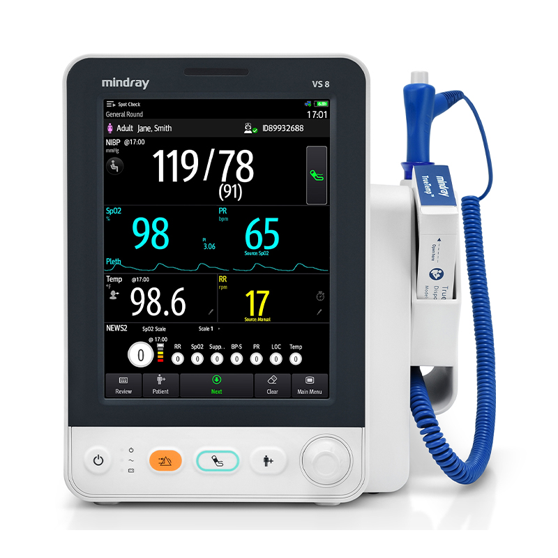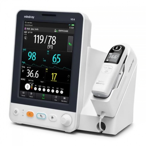 Mindray VS 8 Vital Signs Monitor is a professional vital-signs monitoring device designed for hospitals, clinics, and bedside observation. It supports measurements including NIBP, pulse rate, SpO₂, respiration rate, and temperature. The monitor features Mindray TrueBP™ technology for fast blood pressure measurement in about 15 seconds and offers multiple SpO₂ options such as Mindray, Masimo, and Nellcor. With workflow tools and early warning scoring support, it helps clinicians quickly detect patient deterioration and improve monitoring efficiency.